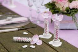 Úžasná svatební dekorace na stůl v podobě sady 48 kusů skleněných tubiček - zkumavek s růžovým nápisem Amour o rozměrech