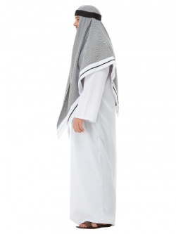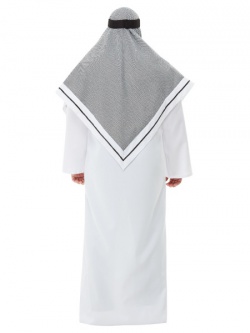 Luxusní pánský kostým šejka z Arábie, tvoří bílá dlouhá tunika a pokrývka hlavy.