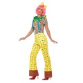 Dámský kostým klaunice v puntíkatých kalhotách, je tvořen veselým barevným kalhotovým overalem, čelenkou se žlutou mašlí a skládaným zeleným límcem.