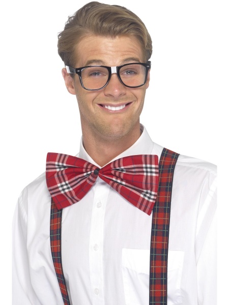 Výbava pro šprta, která obsahuje velkého kostkovaného motýlka a skleněné šprťácké brýle.