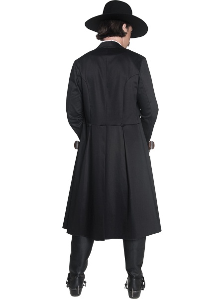 Luxusní autentický pánský kostým šerif z divokého západu, který je tvořen černým pláštěm s vestou, plackou a červenou vázankou.