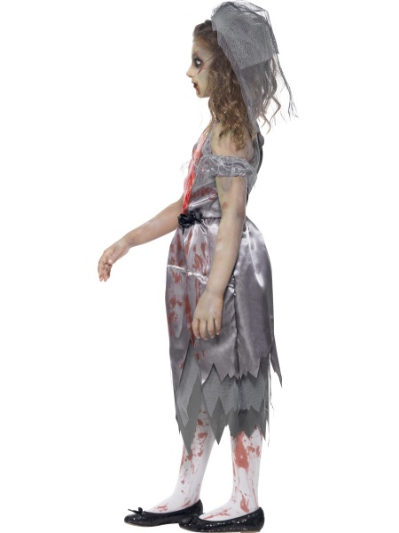 Dětský halloweenský kostým zombie či mrtvé nevěsty tvoří stříbrné krvavé cípovité šaty a potrhaný závoj.