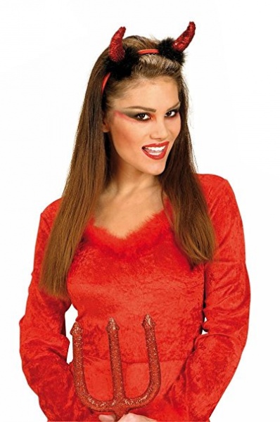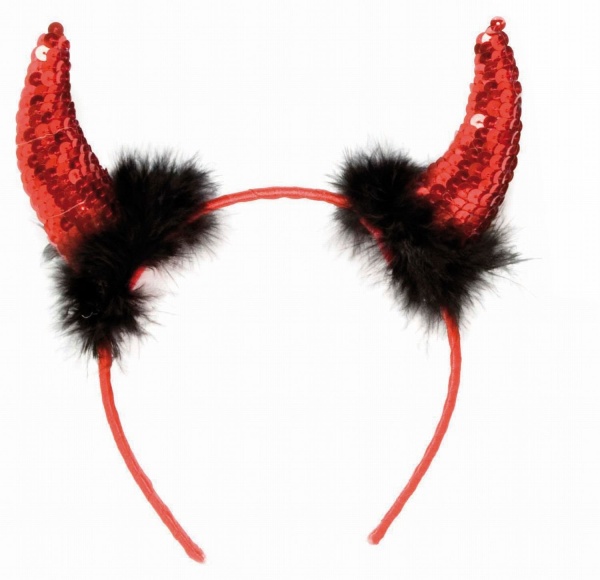 Čelenka s červenými flitrovými rohy jako doplněk čertího kostýmu.