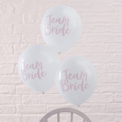 Sada 10 kusů latexových balónků v bílé barvě s růžovým nápisem Team Bride. Parádní výzdoba na rozlučkovou párty.