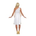 Půvabný, dámský, historický kostým antické Řekyně, který tvoří bílé šaty zdobené zlatými pruhy a čelenka. A můžete vyrazit na párty v duchu pověstí a bájí. Či na pohádkovou párty.