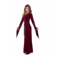 Dámský kostým čarodějky ze středověku, který tvoří elegantní vínové šaty s kapucí s cípatými rukávy a pásek.