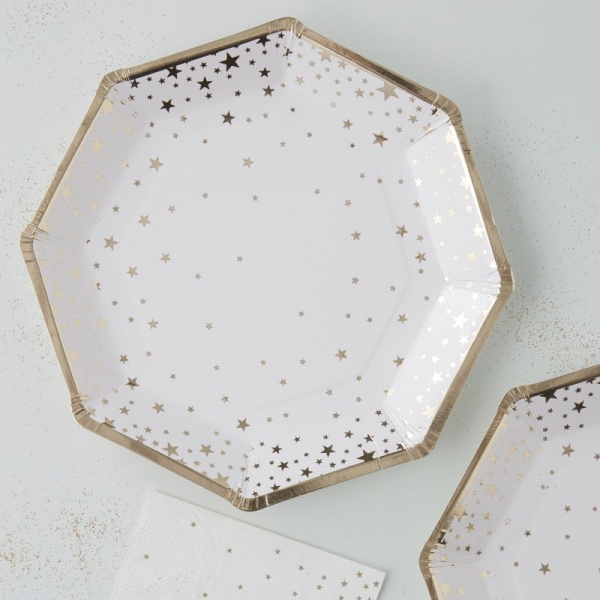 8 kusů papírových osmihranných talířků se zlatými metalickými hvězdičkami o průměru 23 cm. Styl Metallic star.