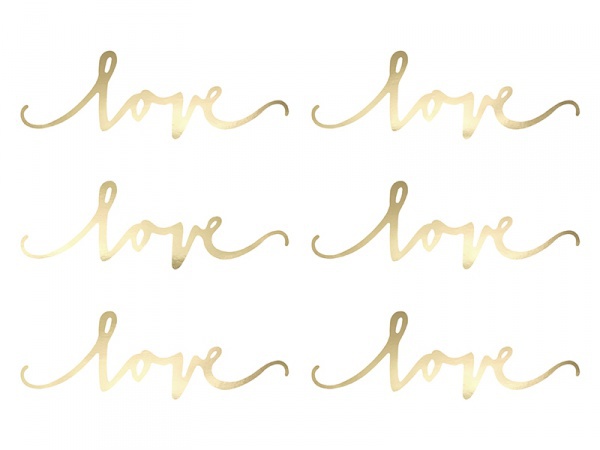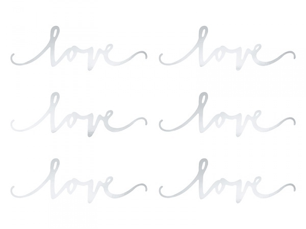 Stříbrná nebo zlatá papírová dekorace Love v sadě 6-ti kusů o rozměrech 6 x 20 cm. Slavnostní stolování.