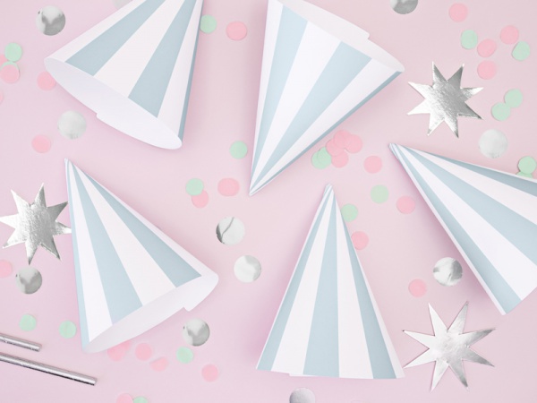 Pruhované papírové modro-bílé párty čepičky. Výška 16 cm. V balení 6 kusů.