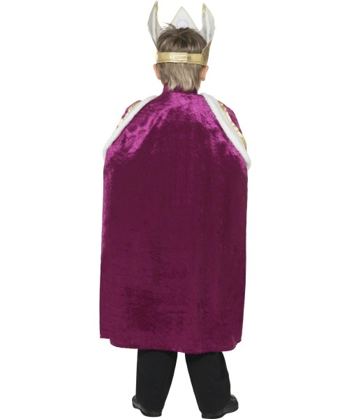 Překrásný dětský kostým krále, složený s purpurového pláště a vysoké zlaté koruny.